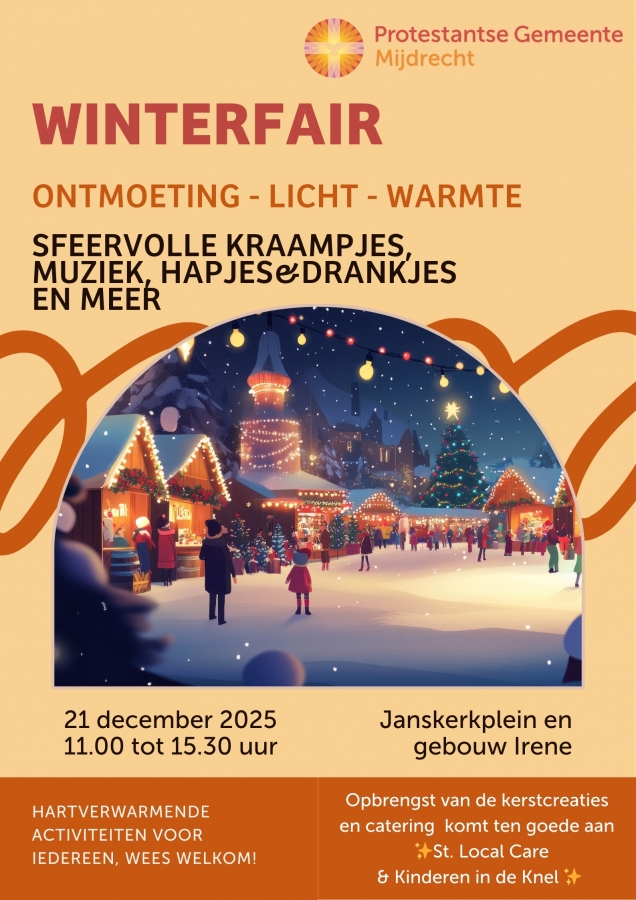 | Aanvullende info: | Op zondag 21 december wordt er een gezellige winterfair gehouden op het Janskerkplein en in gebouw Irene, waarvan de opbrengst wordt bestemd voor het project Kinderen in de knel en Local Care, een organisatie die onder meer steun biedt aan Oekraïnse soldaten die gestrest zijn geraakt door de oorlog. Er is van alles te koop zoals kerstversieringen, sieraden en keramiek. Voor de inwendige mens zijn onder meer zelfgebakken gebak, snert, hamburgers, hotdogs, poffertjes en marshmallows verkrijgbaar. De Winterfair wordt gehouden in aansluiting op de kerkdienst in de Janskerk (van tien uur tot ongeveer kwart over elf) en is open tot ongeveer half vier. Bij minder gunstige weersomstandigheden zal de winterfair in gebouw Irene (naast de Janskerk) gehouden worden. Met deze winterfair wil de kerk uitdragen dat ze symbool wil zijn van saamhorigheid en licht. Iedereen is hartelijk welkom! Steun door uw aanwezigheid Local Care en het project Kinderen in de knel! |